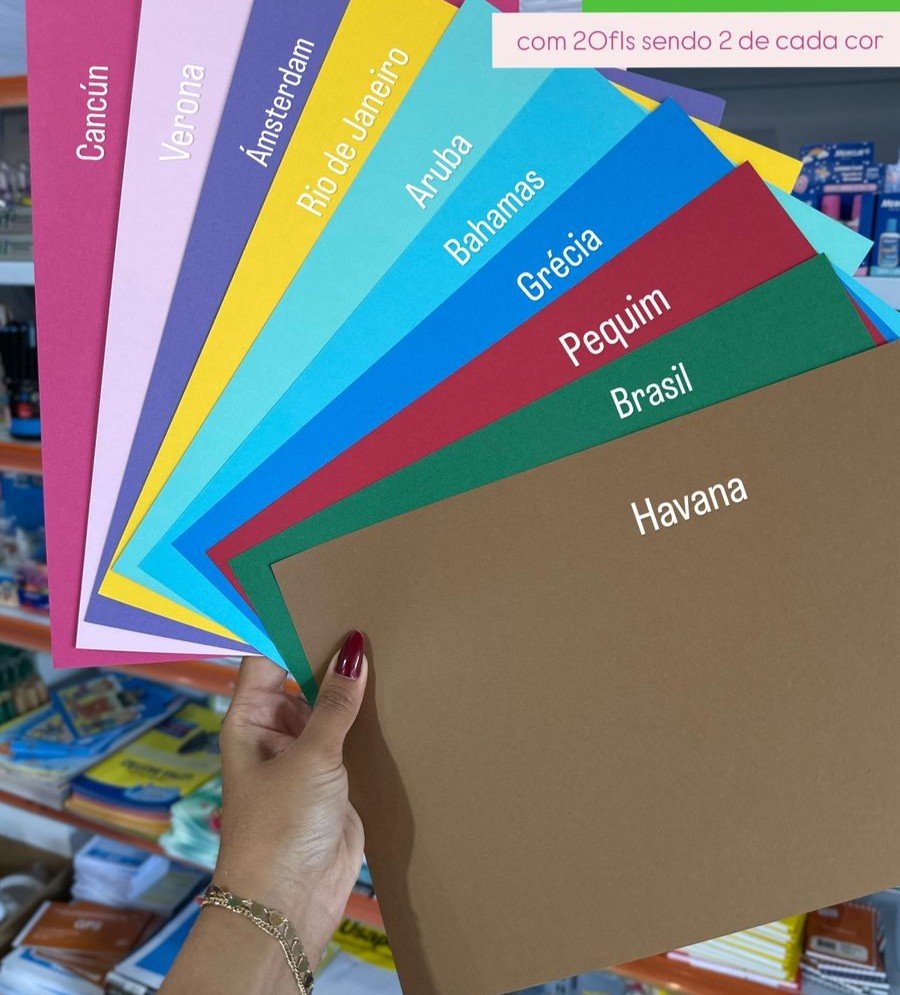 KIT composto por 20 folhas, sendo 2 de cada cor: Cancun, Verona, Amsterdam, Rio de Janeiro, Aruba, Bahamas, Grécia, Pequim, Brasil, Havana.